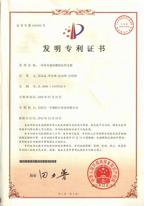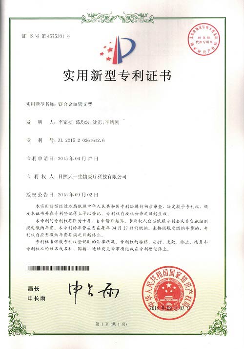 2015年度日照天一生物再次申請兩個(gè)發(fā)明專利,《鎂合金支架的處理液及處理方法》、《藥物緩釋鎂合金支架及其制備方法》,三個(gè)實(shí)用新型專利《充填式疝修補(bǔ)補(bǔ)片》、《藥物緩釋鎂合金支架》、《鎂合金血管支架》,目前發(fā)明專利已經(jīng)進(jìn)入實(shí)質(zhì)審查階段,并在中華人民共和國國家知識產(chǎn)權(quán)局網(wǎng)站上公布。三個(gè)實(shí)用新型專利已由中華人民共和國國家知識產(chǎn)權(quán)局授權(quán)并下發(fā)證書,目前公司已有三項(xiàng)發(fā)明專利,三項(xiàng)實(shí)用新型專利,專利權(quán)人均為日照天一生物醫(yī)療科技有限公司。